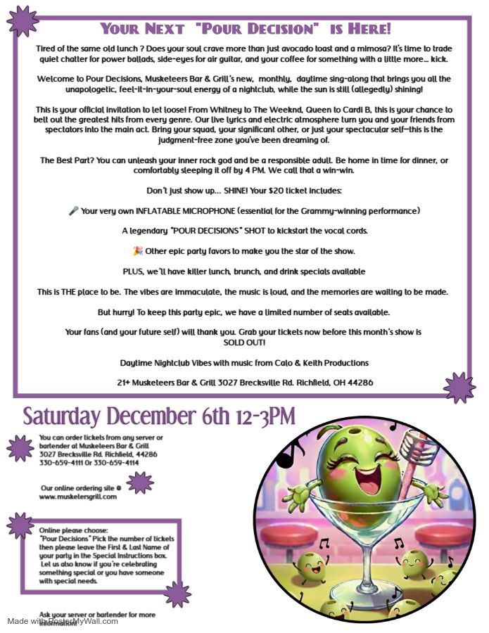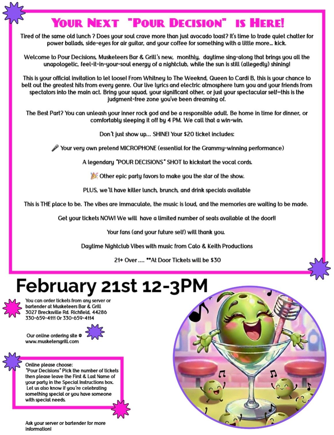Looking for a place to enjoy pizza, chicken wings and a cold brew, while watching sports on TV? At Musketeers Bar & Grill, you'll find delicious food, over 100 beers, a full bar, and Ohio sports.